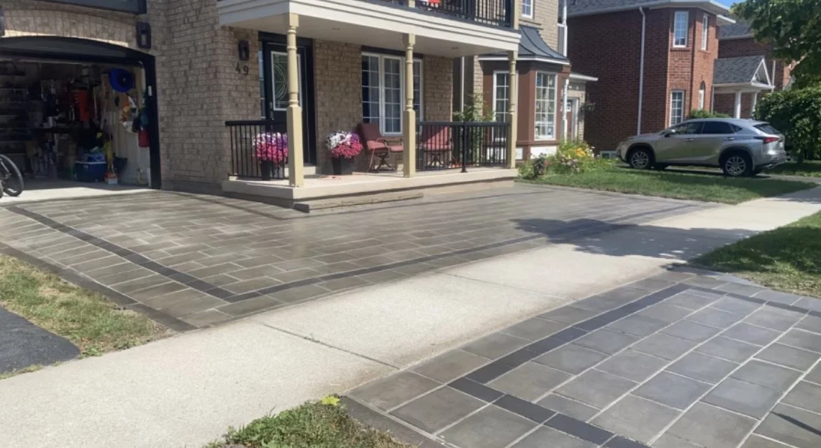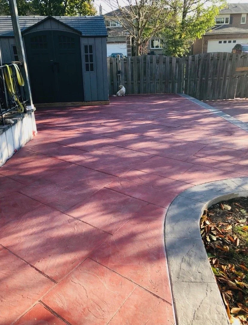 Backyard with red stamped concrete patio, gray border, storage shed, wooden fence, and trees.
