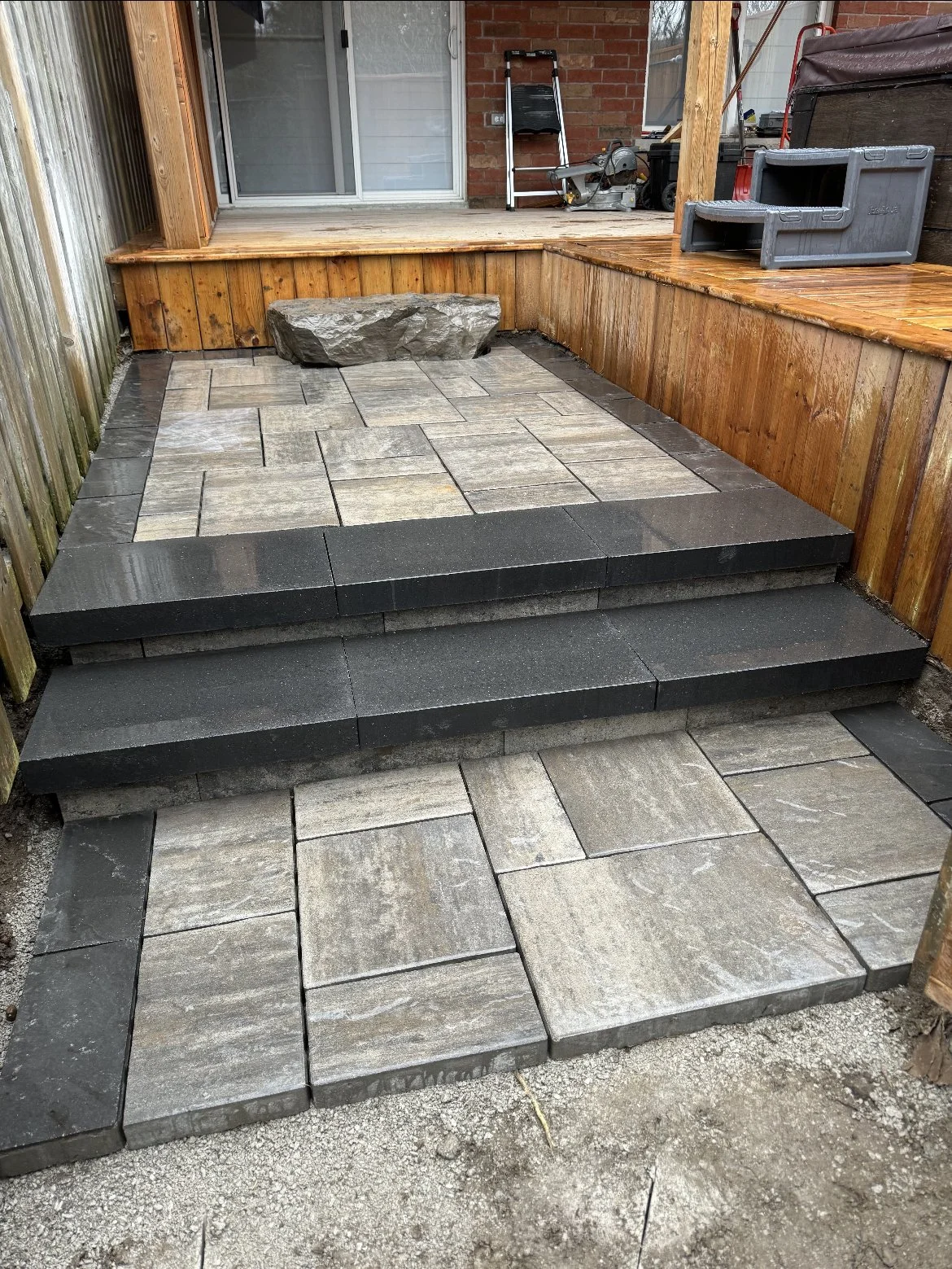 Outdoor patio with multi-colored stone tiles, a staircase leading to a wooden deck, a large rock, and a gray plastic storage container.