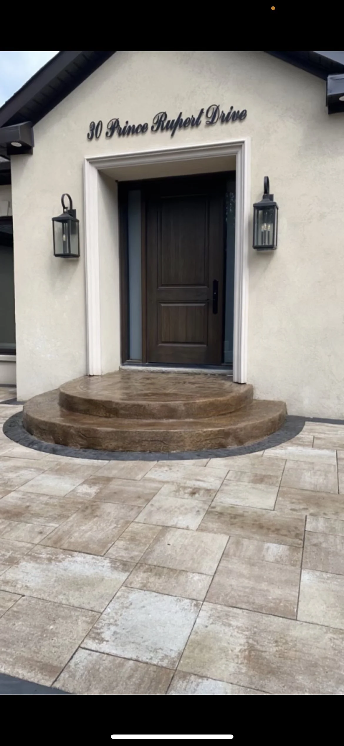 Entrance of a house with "30 Prince Rupert Drive" above the door, featuring wooden door, two wall lanterns, stone steps, and tiled pathway.